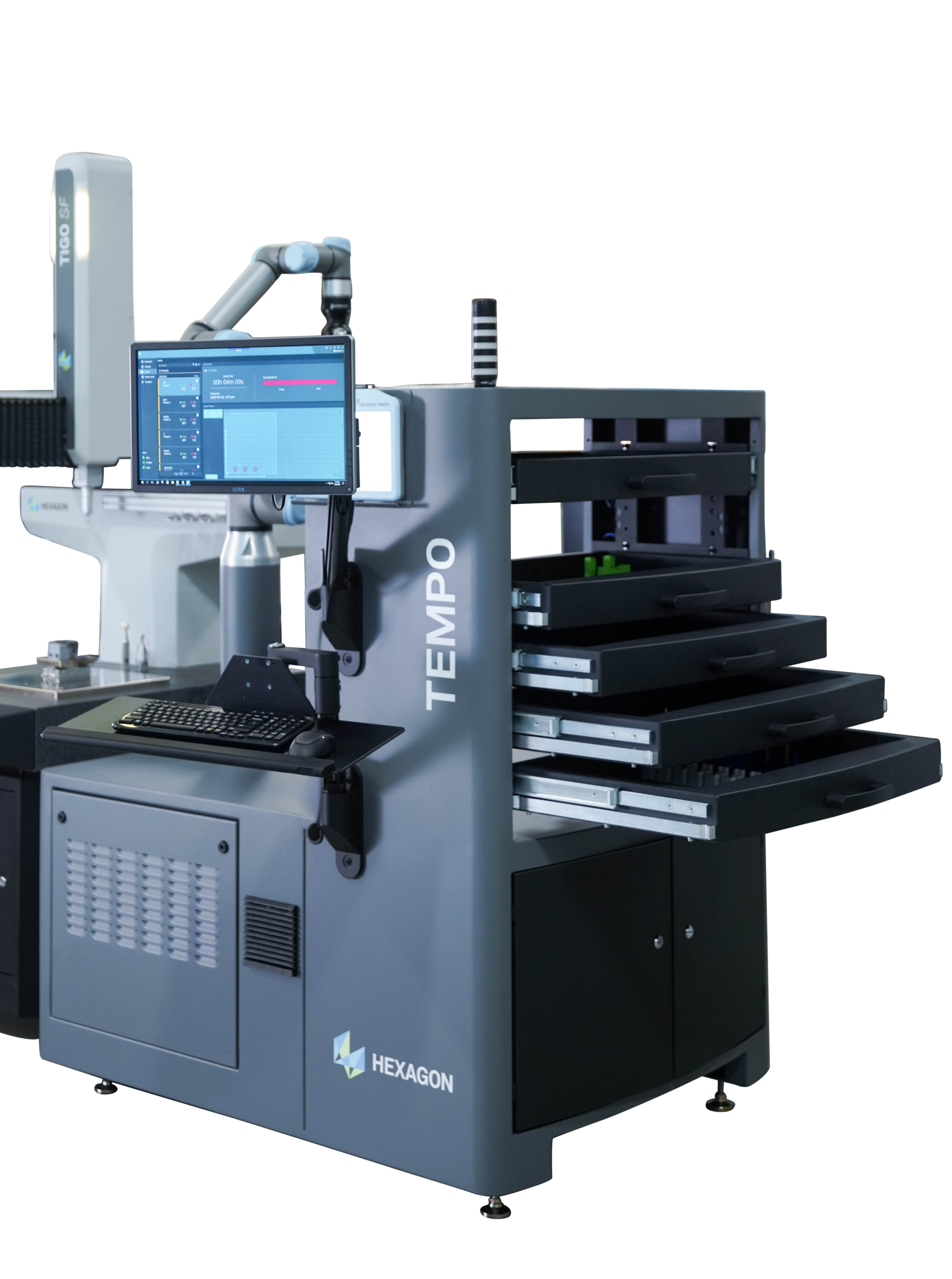 測定の自動化という分野においては、「TIGO SF」 などの当社測定機に、ワークのストッカと段取り替え用の協働ロボットおよび専用ソフトウェアを組み合わせた、「TEMPO」というパッケージ製品を提供していますが、Hexagon独自の技術により、さまざまな全自動測定・統合への要求に応える拡張性も備えています。