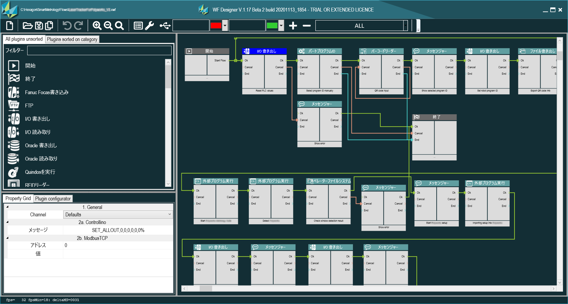 このうち 「Designer」 は、制御側からの入出力信号を含め、測定開始から結果出力までの一連の自動制御を定義するアプリケーションであり、 Windows のグラフィカルなユーザインタフェースで工程を定義できます。これにより、 PLC の専門知識は不要となり、かつ Windows 上のソフトウェアであるが故に、一般的な PLC では処理が困難であるサーバ等とのネットワークを介した通信、例えばワークの詳細情報の受信や測定結果データ送信といったファイル交換、外部プログラムの起動や終了待機などの機能も容易に実装でき、バーコードリーダや RFID などの外部入力も統合可能となります。