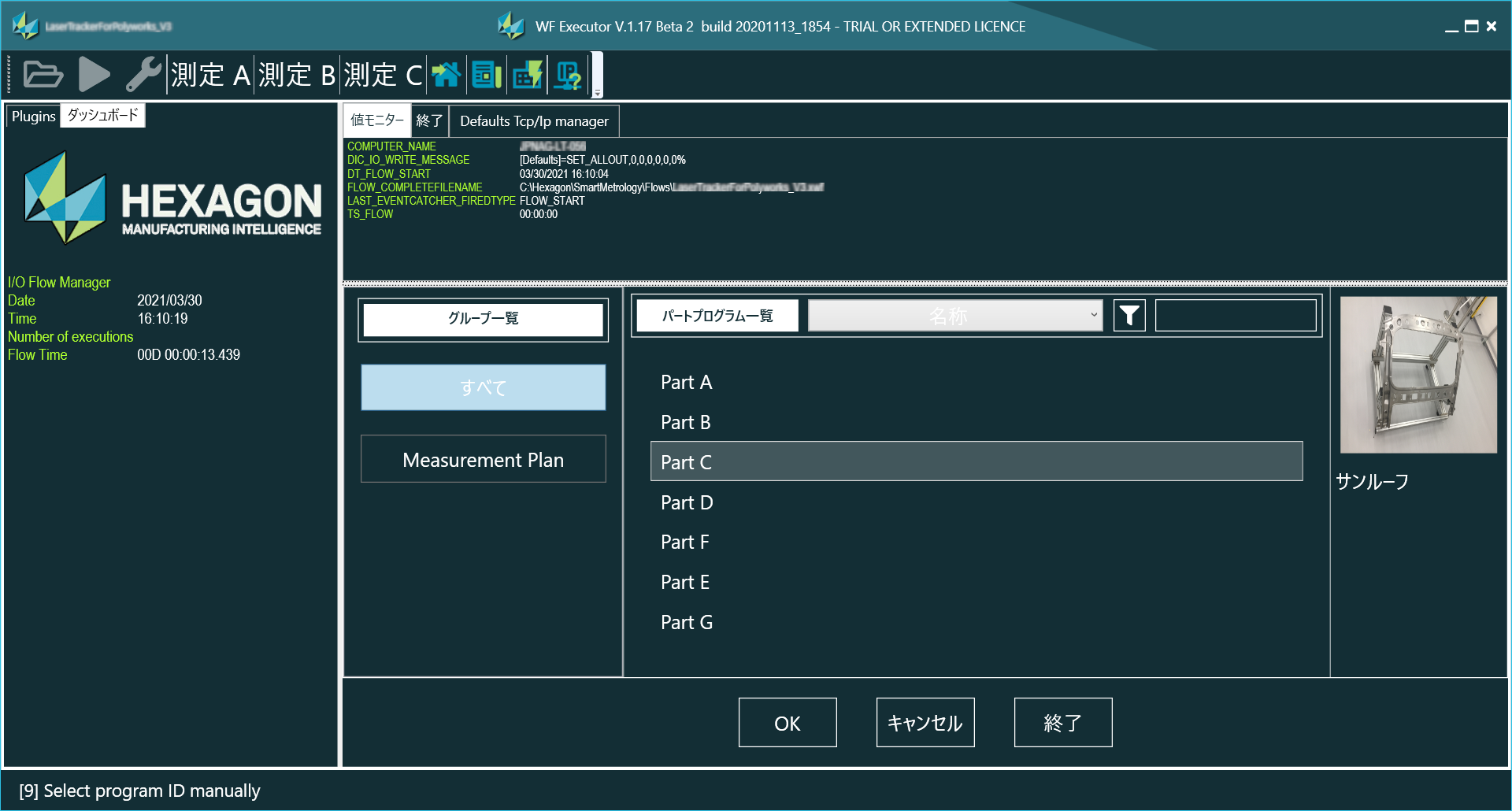 また、 「Executor」 は三次元測定機のコンピュータ上で実行する、自動工程の実行とユーザインタフェースとなるアプリケーションです。オペレータにより段取り替えを実施する半自動セルの場合は、バーコードリーダなどとあわせた測定ワークの選択画面や測定レポートなどを表示し、全自動の構成の場合は、通信状態などを表示することができます。