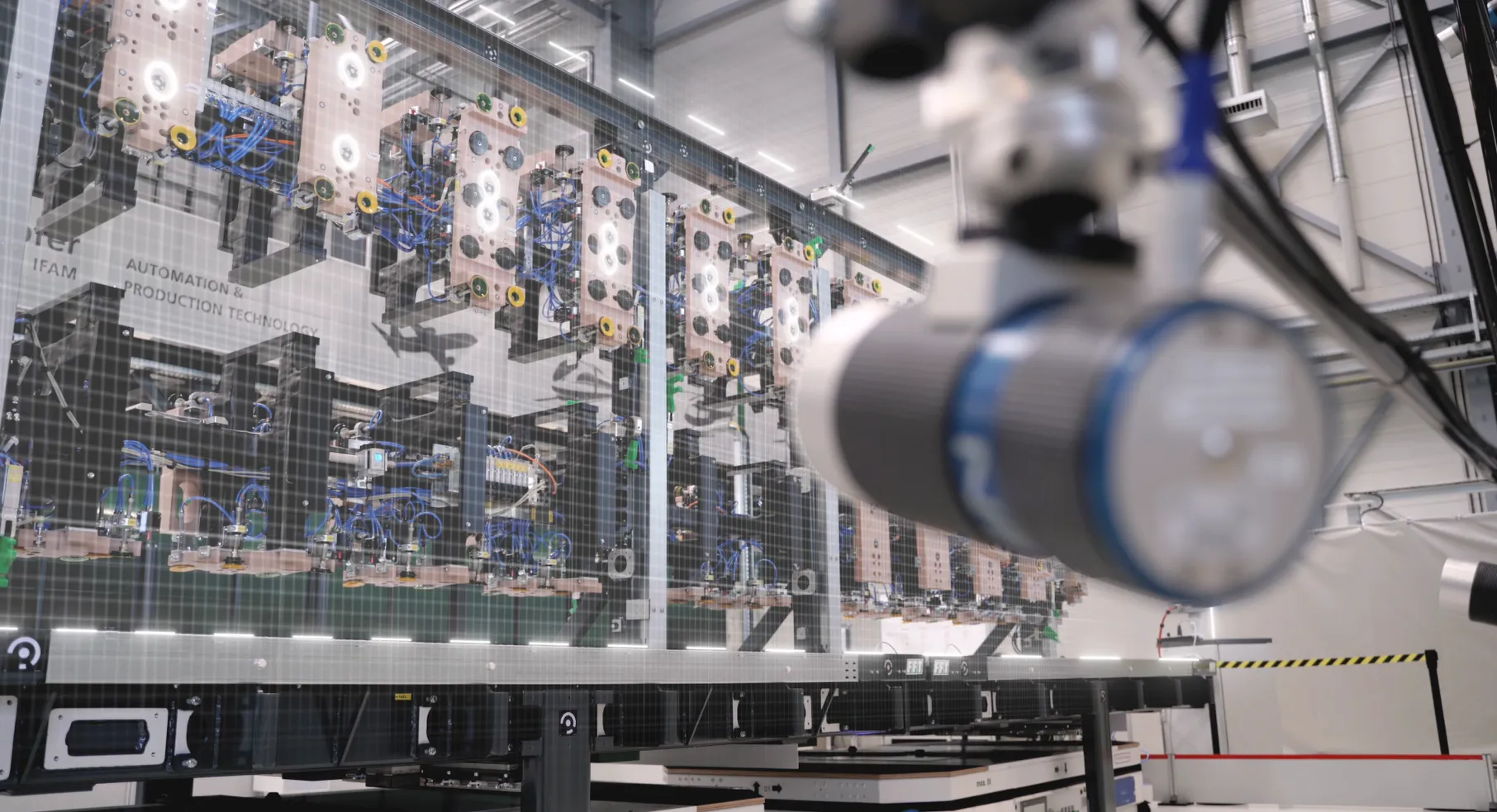 その後、作業構成部品は保持固定具にマウントされます。搭載された部品は搬送前に固定され、自動搬送車が次の生産工程である形状参照・検査工程に移動します。