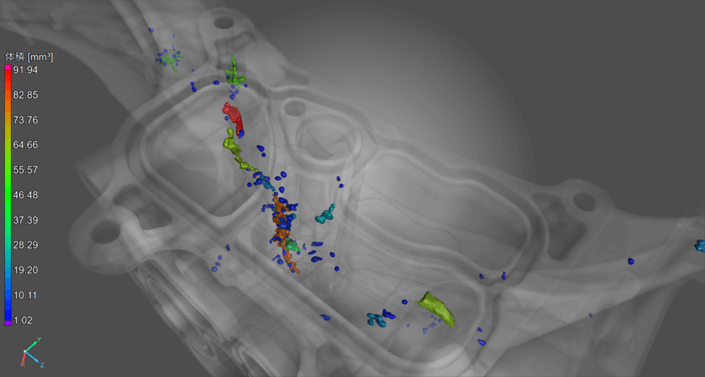 産業用CTデータを可視化できるだけではなく、さまざまな機能が備わっています。まず、不具合の主な原因である鋳巣の発生部位を特定できます。鋳巣の位置や大きさ、分布、形状を定量化できるため、適切な改善ができるでしょう。