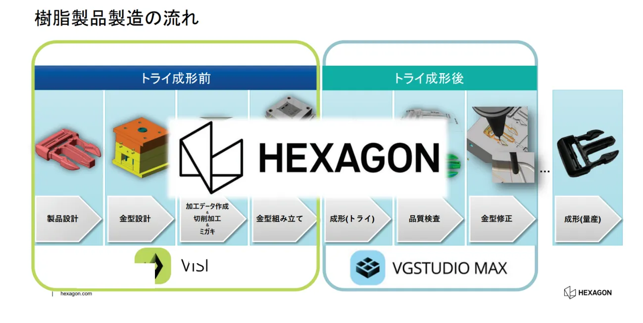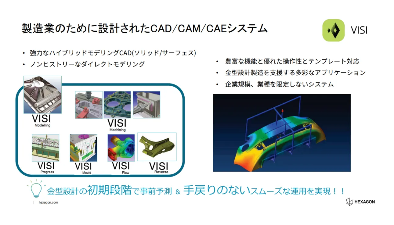 また、Hexagonが提供するVISI (CAD/CAM/CAE)・VGSTUDIO MAX (CAT “computer aided test”)といった統合ソリューションを活用することで、設計・解析・製造・検査をデジタルデータでシームレスにつなぎ、ものづくり全体の効率化と高度化を推進できます。