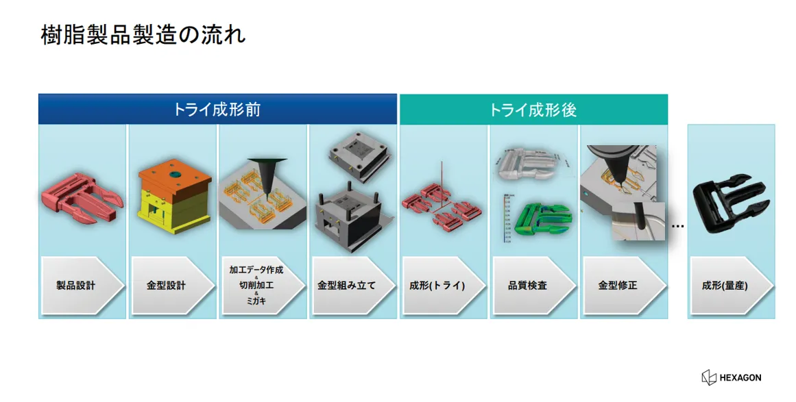 こうした課題に対し、Hexagonのソリューションを組み合わせた「トライ成形前のCAE解析による不具合予測と設計最適化」と「トライ成形後のX線CTによる非破壊検査とフィードバック」という2つのアプローチを組み合わせる手法をご紹介します。本記事では、それぞれの役割と具体的な活用法を整理し、効率的な金型立ち上げの方法を解説します。